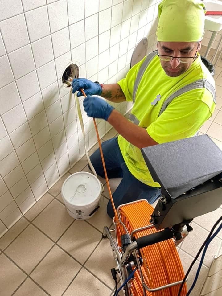 A sewer scope is when we put a small camera down your sewer line to see what’s going on in there. The camera goes through your pipes and shows us everything – from small cracks to big roots that might be growing into your line.